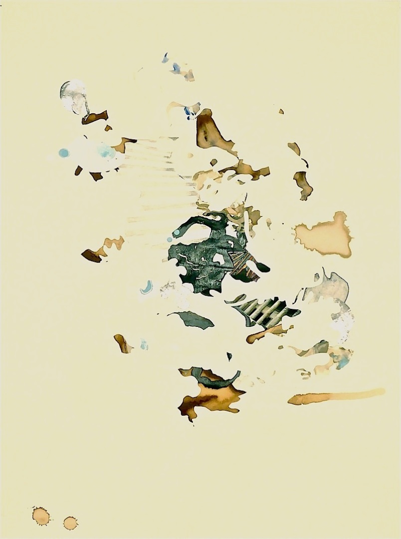 Coffee, paper, photo collage, graphite, colored pencil, foil, marker and ink on paper