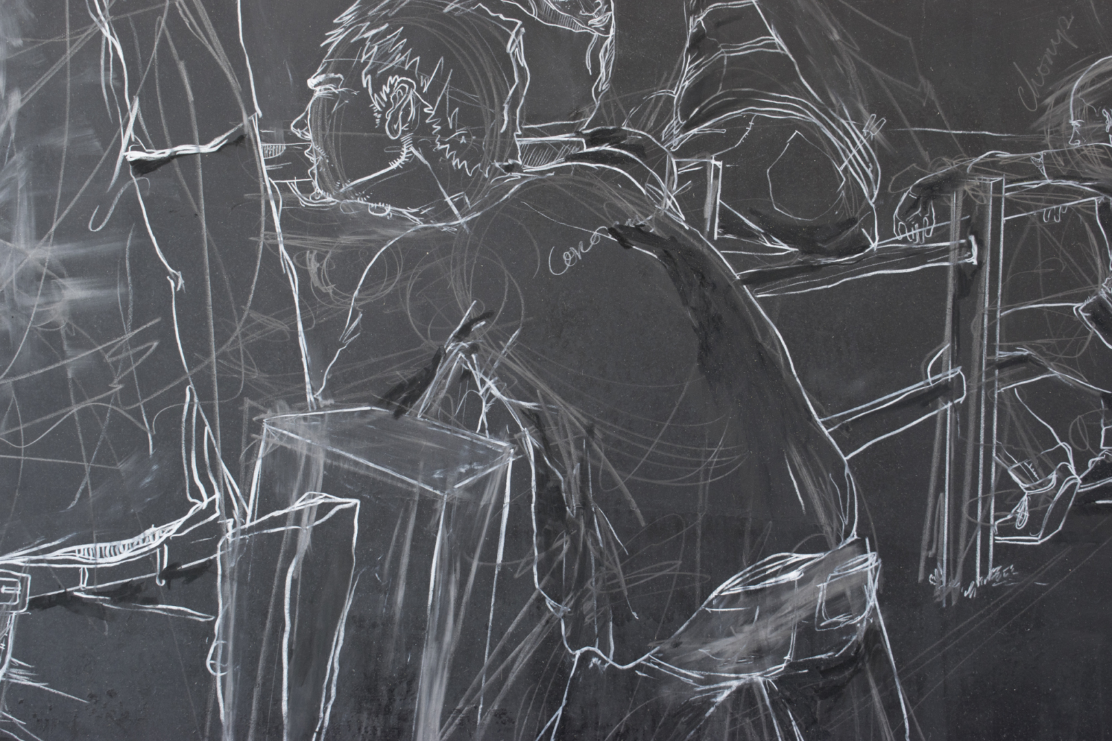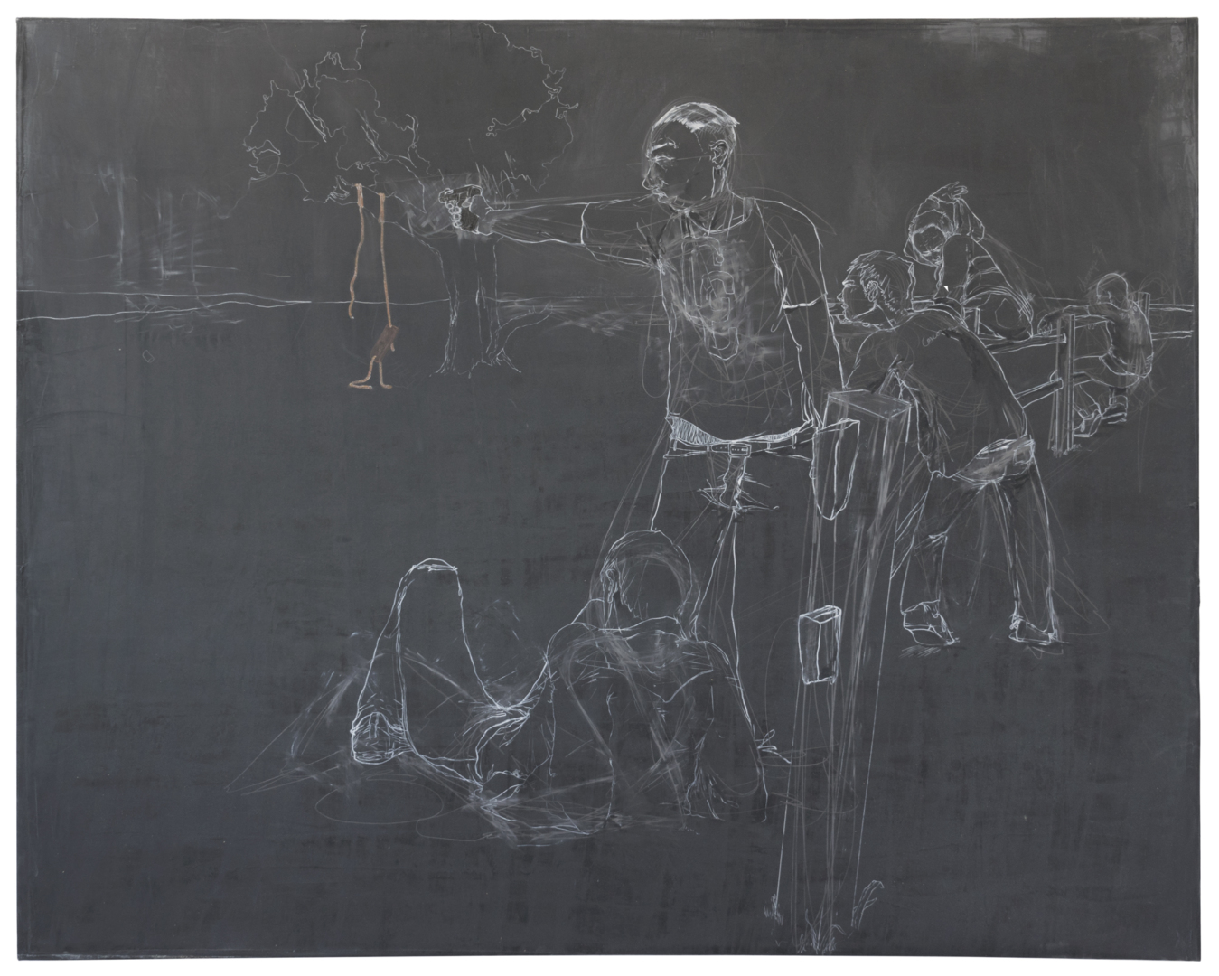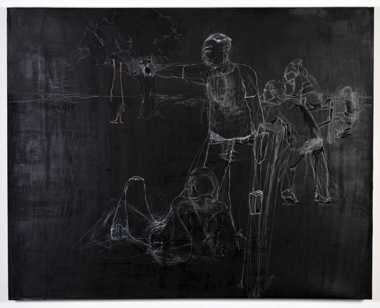 Black ground, greased pencil, charcoal and oil on canvas over panel