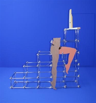 The visitor has a sense of having walked into a television studio set. Walls, floors, everything is blue. A blue that is so clear and unnatural that it could later be replaced at will by any other background. In the context of the normal white, ‘neutral’ gallery space, the viewer has the opportunity to create his own context, his own setting. For her solo exhibition at Galerie Fons Welters, the British artist Anthea Hamilton is creating a temporary environment of found and shaped objects. Paint cans, candles, shoes, bamboo, perspex and string are just some of the materials she combines to make her three-dimensional composition. Incorporated into the completely blue space, the objects interact with the environment and themselves become actors in the TV studio set. The cross-section of a leg is the most recognisable element in Hamilton’s eclectic use of materials. It is modelled on her own leg, so that her identity is literally absorbed into the exhibition. In this way, the different versions of the artist, the ‘body doubles’, can act out her unfulfilled ideas and fantasies. The legs keep recurring in different combinations, in settings ranging from the figurative to the mechanical. Reduced to a minimal template, the soft, round forms seduce and betray at the same time. An imagery is forged in which pop-art-like collages are subdued by a constructivist composition. Or is it, perhaps, the other way round?
