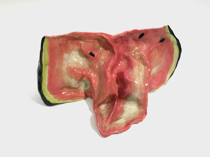 Rotting, wounded, smiling—watermelons, in Valerie Hegarty’s latest exhibition of paintings and sculptures, are depicted as sentient objects: carnal, threatening. Several wedges of the fruit, done in ceramics, rest on a plinth, their pink flesh resembling gums and growing teeth, tongues, ribs, stalagmites, barnacles. They make one think of the chemically modified watermelons that spontaneously exploded across fields in China in 2011—a warning about the perils of mutant capitalism.