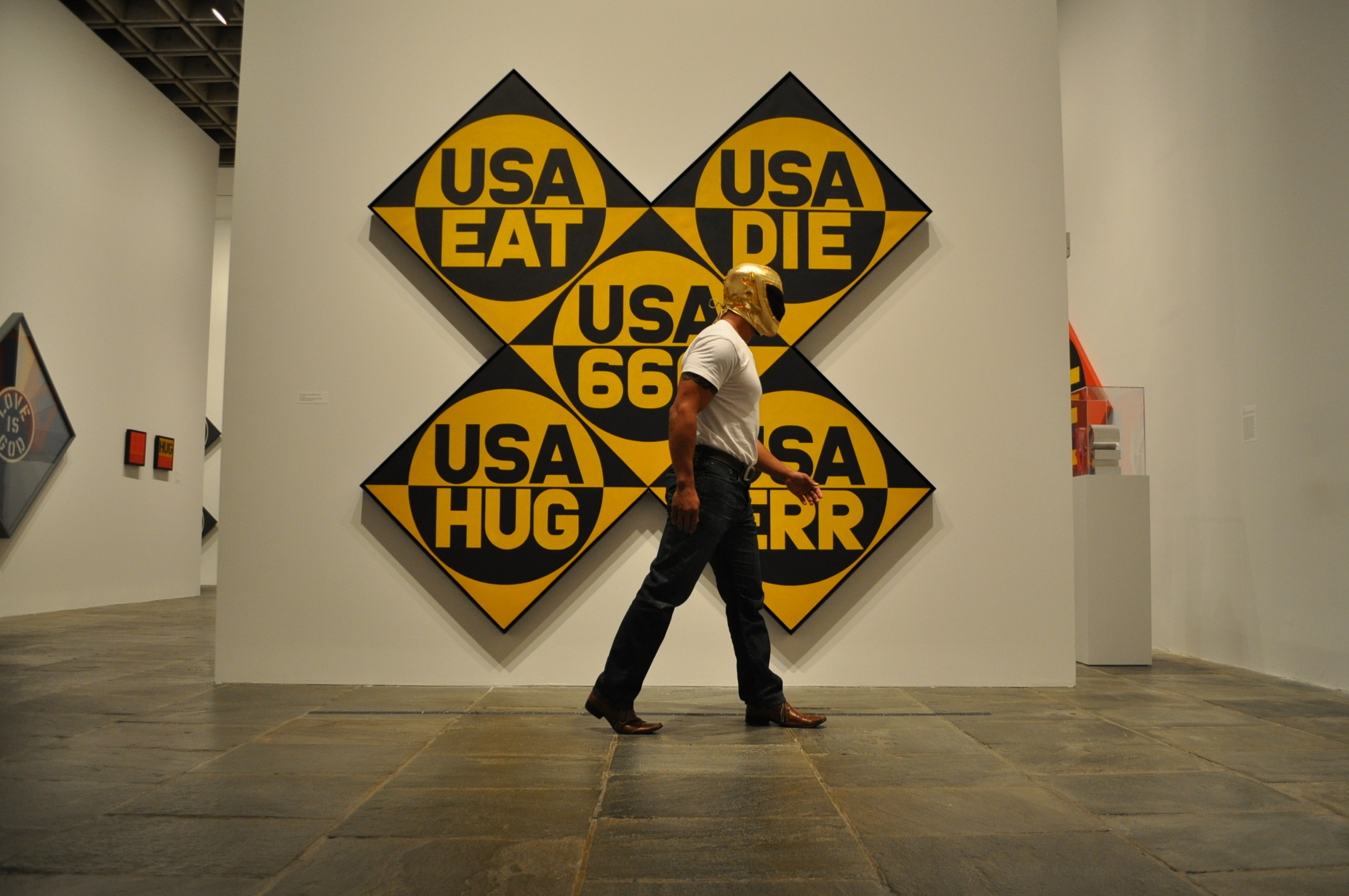 For the past few weeks, with our artist in residence Clifford Owens, we have been writing our own one-line “scores” for performance pieces and performing them, as well as learning about the history and importance of performance art in the canon of American art. On October 29, we had the pleasure of a visit from performance artist Shaun Leonardo who gave us some insight into his own performance art work. Leonardo began by explaining how he combines his identities as a Hispanic man, football player, and artist to develop his unique body of work. After showing us clips of his performances, we discussed how he uses recognizable masculine gestures to comment on American society. Then we headed up to the Robert Indiana: Beyond LOVE exhibition. We were given time to explore the show and pick a favorite piece before we divided into groups. Each group collectively chose an artwork and created a “still” performance based on our interpretation of Indiana’s work and how it speaks to our own life experiences. Owens photographed our performances. For our final activity, five people were chosen to perform individually for the group. Owens assigned each performer a one-line “score” written by one of the Writers. I performed the score, “Express anger without showing violence.” To prepare, I thought about how I feel and process anger. For my performance, I walked through the audience in silence while making intense eye contact with individuals. Once immersed in the crowd, I selected a person at random who I stood over and glared at, then slowly removed either my sweatshirt or shoes and angrily placed them in front the person. After my performance, the primary reaction from the audience was that I scared people with my intensity. The highlight of the day for me was interacting with the audience during my performance, as well as getting feedback from Leonardo and Owens. It was great to get a new perspective on what performance art is and it was interesting collaborating with other YI Writers on the group performances. By Tess W, Youth Insights Writer